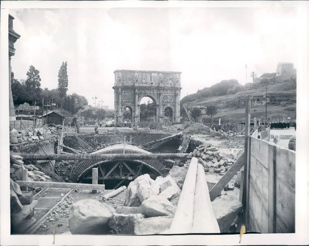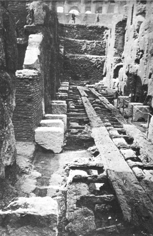 When the western side of the underground was reached in 1939, a heap of columns from the upper porch and structures of the cavea were found. The square around was completely asphalted, so that cars could even go inside the corridors and under the Arch of Constantine.