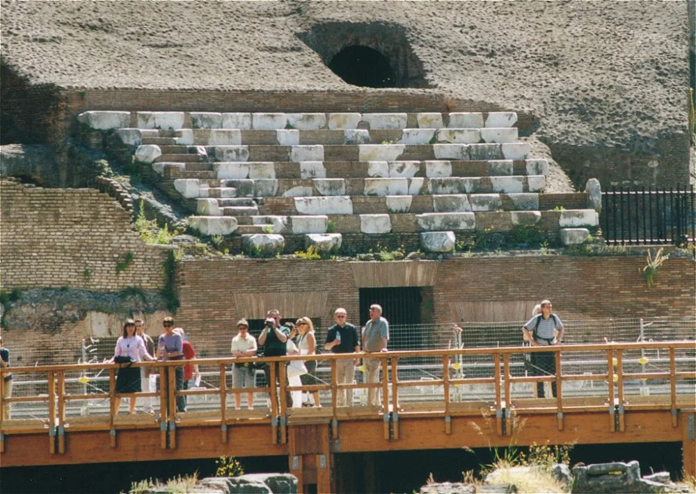 The Colosseum was then adapted so as to accommodate mass rallies: some corridor floors were covered with asphalt, connection stairs were made that modified the original structure, and a small section of the cavea with seats was inaccurately reconstructed in 1933 (there were no seats there, but wide steps where the Senators placed their personal chairs). See the picture on the right.