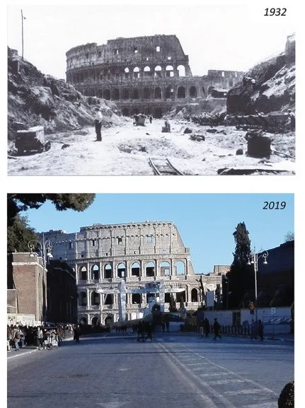 Despite the 1931 Rome plan, which did not provide for any street in the area of the Fora, in the same year the works started for the new avenue from Piazza Venezia to the Colosseum. This project was strongly wanted by Mussolini, not only to make the increasing car traffic more fluid, by connecting the centre of Rome to new expanding areas, but also to create a wide avenue for parades and to build an enormous Palace of the Fascist Party. In this way he could also see the Colosseum from his famous balcony of Palazzo Venezia.