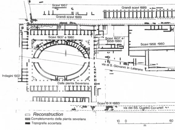 Mappa del Ludus Magnus, vicino al Colosseo. La parte superiore, più scura, è stata scavata; il resto è ancora sotto case e strade del XVIII e XIX secolo