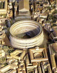 La foto a sinistra è un particolare del plastico di Roma in età costantiniana conservato nel Museo della Civiltà Romana. Il Ludus Magnus è di fronte al Colosseo, leggermente sulla destra, mentre sulla sua sinistra c’è il Ludus Matutinus. Alle spalle c’è il tempio di Venere e Roma: tra questi e l’Anfiteatro si intravede la colossale statua di Helios Invictus, già di Nerone.