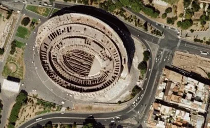 I resti attuali del Ludus Magnus, con parte dell’arena e degli alloggiamenti sono visibili sulla destra della foto qui sopra, presa dal satellite.